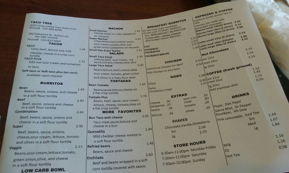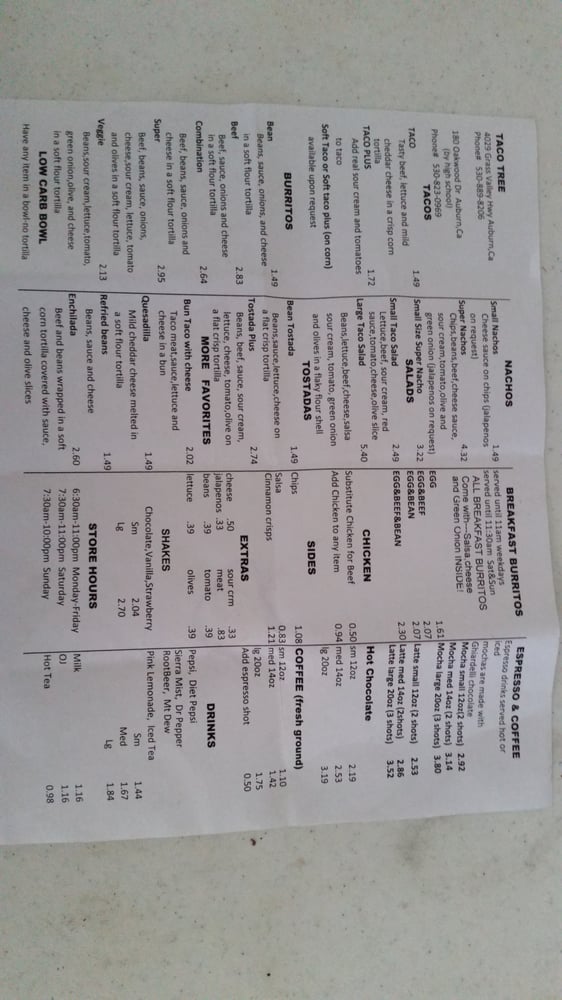 Taco Tree in Auburn, CA offers fast, fresh, and delicious Mexican food. Customers rave about the chicken taco salad, beef bean burrito, burritos, tacos, and tostadas. The menu is simple, with options to customize your meal with extras like sour cream and tomatoes. Prices are slightly higher than typical fast food taco joints, but the portions are generous and packed with fillings. The staff is friendly, and the service is fast. Customers appreciate the real cheese in the burritos and the flavorful taco sauce packets. Overall, Taco Tree provides a satisfying meal in a casual yet classy atmosphere. Whether you're looking for a quick Mexican meal or a spot for lunch or dinner, Taco Tree is a recommended choice in the area.